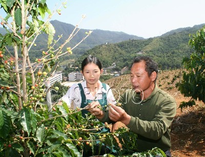 11月3日,在福建南靖县南坑镇“漳州天绿(南坑)咖啡示范基地”,技术员(右)正在向女员工传授咖啡挂果管理技术。台商黄文广先生投资500万美元,选择在福建南靖县南坑镇创建“漳州天绿(南坑)咖啡示范基地”,经2年多的努力,现已建成福建省首个台湾百亩咖啡观光园和首个台湾咖啡种植示范基地,带动当地农民种植良种咖啡400多亩。计划在3年内,全县建成5000亩台湾咖啡示范基地,配套建设咖啡观光休闲中心、咖啡加工厂等项目。