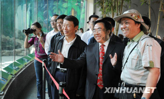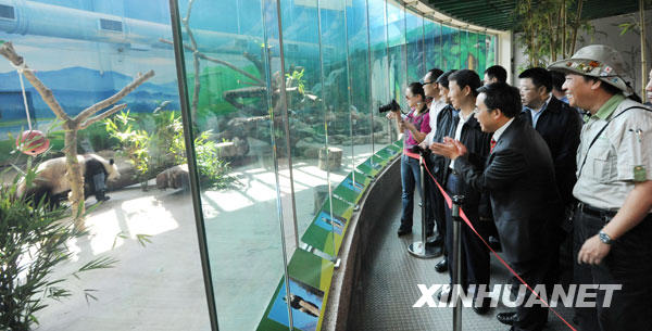 日前随四川经贸交流团来台的中国保护大熊猫研究中心主任张和民等人11月8日来到台北市立动物园,在园长叶杰生陪同下一起探望赠台大熊猫“团团”“圆圆”。原本“团团”正在吃竹子,“圆圆”正在睡觉,或许是心灵感应,当张和民靠近时,它们不约而同地起身,在馆内踱来踱去。新华社发(吴景腾 摄)