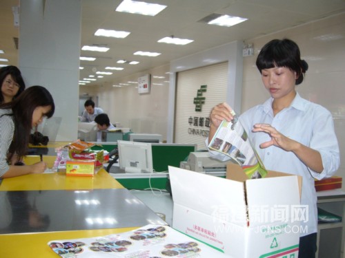 11月10日,“闽台一家亲”福州对台包裹旅游搭载宣传活动在福州启动,在对台包裹中搭载大陆旅游宣传资讯,在大陆尚属首创。图为邮局工作人员在在包裹里放旅游宣传广告单。 (詹托荣 摄)