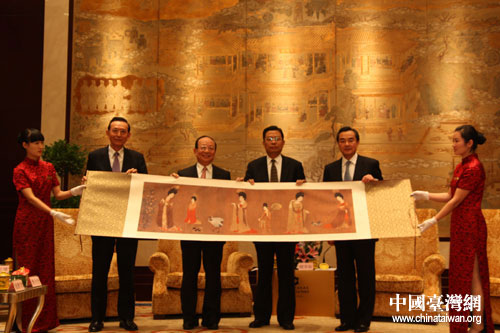 陕西省委书记赵乐际向中国国民党副主席蒋孝严赠送了唐代周昉的《簪花仕女图》。(中国台湾网 肖燕 摄)