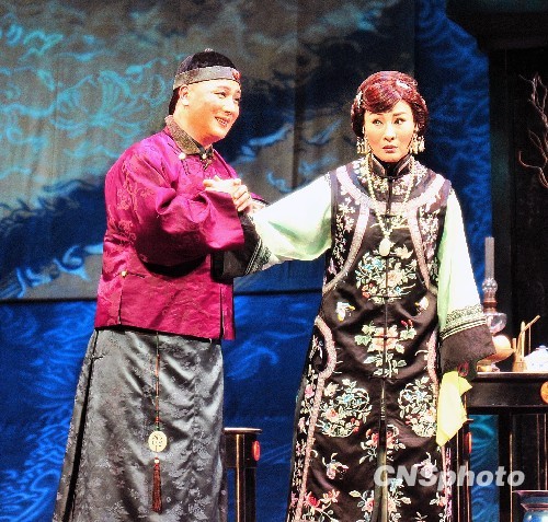 12月1日晚,“台湾第一梅派青衣”之称的魏海敏(图右)来闽演出剧中饰演曹七巧,将张爱玲笔下人物的渴望、失落、压抑,以及“疯子般的审慎与机智”等复杂心态表现得淋漓尽致,艺震全场,魏海敏是唯一获梅花奖的台湾京剧演员,剧中另一主演唐文华(左)为台湾第一老生。当晚,台湾国光京剧团一部集编导、导演、演员、舞台设计完全“台湾制造”的京剧《金锁记》在福州凤凰剧院与榕城戏迷见面。 中新社发 张丽君 摄