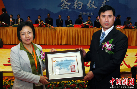 5月14日,高雄市联合贸易促进会(右)与中国贸促会南平支会(左)双方代表在武夷山签约缔结为姐妹会,第十三届海峡西岸武夷国际投资洽谈会大会为二会颁发缔结友好证书。高雄市联合贸易促进会何主任表示,两地贸促会签约后首先进行今年茶博会项目的合作,届时两地茶商可以有更好的平台进行交流。中新社发 张丽君 摄