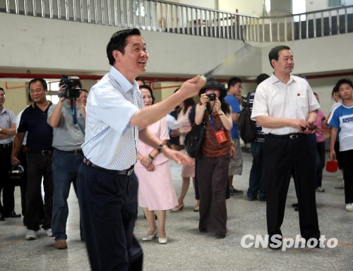 5月26日,在台湾参访的中共四川省委书记刘奇葆一行到“9·21”地震灾区南投县参观考察,图为他走访埔里小学时与学生打羽毛球。 中新社发 邹辉 摄