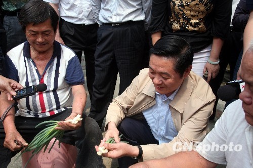 5月26日,中共四川省委书记刘奇葆一行到台湾“9·21”地震灾区南投县参观考察,图为他走访安置震后老人的埔里镇菩堤长青村时,蹲在地上与福利社区老人一起边择菜边聊家常。 中新社发 邹辉摄