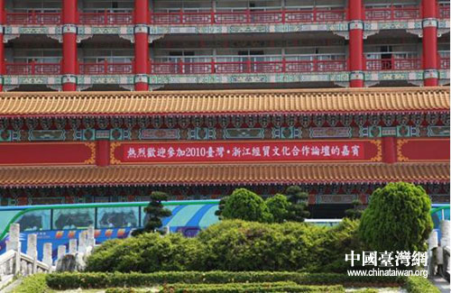 圆山饭店门口悬挂的欢迎横幅。(浙江省台办王健摄)