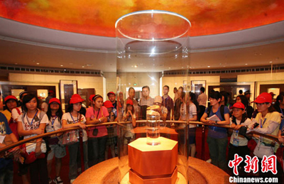 图为成都金沙遗址博物馆内的“太阳神鸟”吸引台湾学生。中新社发 刘忠俊 摄