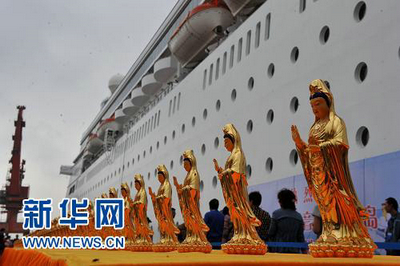 随着一声汽笛长鸣,载有1000尊南海观音佛像的邮轮于27日下午驶离舟山老塘山码头,开往台湾为民众祈福。