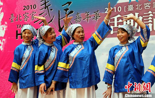 10月12日,2010年台北客家义民嘉年华在台北举行发布会。图为穿着客家传统服装前来参加发布会的岛内客家乡亲,现场为嘉年华活动造势。 中新社发 王健 摄