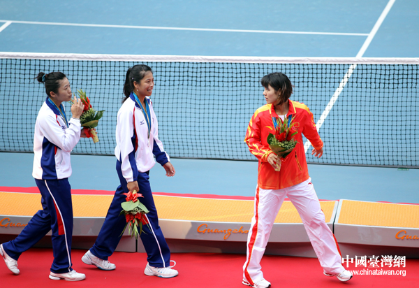 中国台湾网11月16日广州消息 第十六届广州亚运会女子网球团体赛决赛,虽然中华台北队不敌中国队,获得银牌,但在颁奖仪式上,两岸女网金花们却十分轻松,交流不断。(记者 钟宝华)