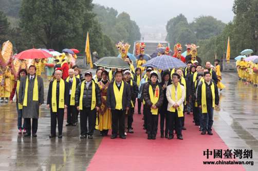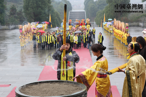 在全体肃立、击鼓九通、鸣金九响、鸣炮奏乐、敬献贡品(三牲、五谷、时鲜)后,湘籍后裔、台北市议员黄珊珊作为主祭人向中华民族始祖炎帝虔诚敬香、敬献花篮并三鞠躬。黄珊珊深情地宣读了祭文,一句“湖湘子弟情系两岸”感动了在场所有嘉宾。之后,台湾嘉宾前往谒陵广场举行开午门谒陵仪式。
