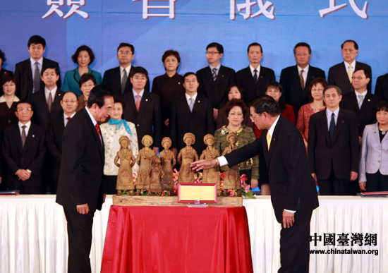 12月21日下午,海协会会长陈云林与海基会董事长江丙坤正式签署《海峡两岸医药卫生合作协议》,双方并在协议签署后互赠礼品。图为海基会致赠海协会方面的陶土作品《齐心传唱 和谐天籁》。(中国台湾网 钟宝华 摄)