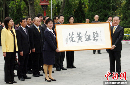 3月29日,台湾新党主席郁慕明率新党黄花岗七十二烈士辛亥百年致敬团一行,前往广州黄花岗七十二烈士碑前致祭烈士。图为郁慕明主席(右)向烈士敬献牌匾。 中新社发 罗仰明 摄