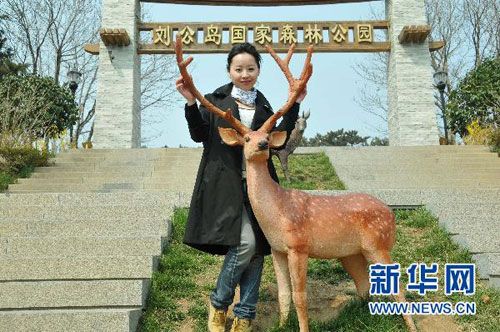 4月14日,一位媒体记者在刘公岛国家森林公园门前与梅花鹿雕塑合影。 台湾梅花鹿“繁星”“点点”和长鬃山羊“喜羊羊”“乐羊羊”将于4月16日正式入住威海刘公岛国家森林公园。 新华社记者 邓卫华 摄