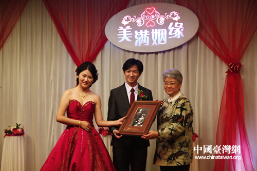 北京姑娘王菲和台北小伙何承谚在一场两岸青年的交流活动中相遇相识,经过四年爱情长跑于9月25日迈入婚姻殿堂,图为中国宋庆龄基金会副主席唐闻生向菲菲、承谚赠送孙中山、宋庆龄结婚照。(中国台湾网 徐维彬 摄)