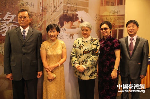 中国宋庆龄基金会副主席唐闻生出席喜宴并与双方父母合影。(中国台湾网 徐维彬 摄)