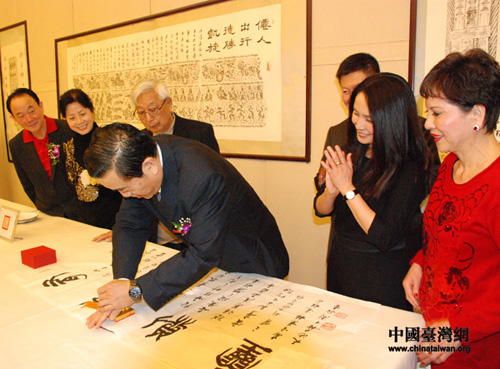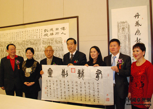 两位书法家向台湾省花莲县秀林乡捐赠人民币300万元筹建“爱心图书馆”。 (中国台湾网 刘莹 摄)