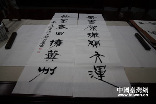 台中市政府参事兼主任、勤益大学文创系助理教授更是在河北省图书馆挥毫泼墨,留下“图书架满开大运 翰墨春回拥冀州”!(中国台湾网 高斯斯 摄)