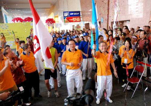 林文光(举火炬者)接过火炬后,成为首位传递的火炬手。(图:印尼星洲日报)