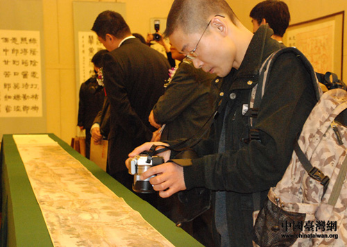 嘉宾们认真参观现藏于台北故宫博物院的清院本《清明上河图》。(中国台湾网 刘莹 摄)