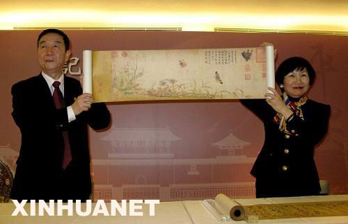 资料图片:3月2日,郑欣淼(左)与周功鑫共同展示故宫博物院赠送的宋朝赵昌的《写生蛱蝶图》复制品。当日,故宫博物院院长郑欣淼与台北故宫博物院院长周功鑫在台北故宫就两岸故宫加强合作等进行了会谈,并就实质性合作达成八项共识。新华社记者 王妍 摄