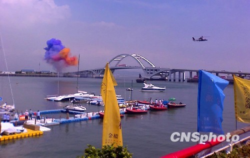 九时五十分许,福建省委常委、厦门市委书记于伟国一声“启航”指令,十五艘帆船在海巡舰、海警、直升飞机的引航护航下,成梯队缓缓驶离五缘湾港,经过高高的五缘大桥,前往比赛起航线大担岛。
