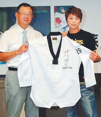 台湾跆拳道选手苏丽文(右)捐赠北京奥运战袍上网义卖,支持台湾世界展望会灾后重建,最后由台开以六十五万得标。图片来源:联合报