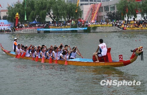 中新社枣庄6月12日电 (记者 彭红 闫锋)中国传统节日端午节前夕,首届海峡两岸龙舟邀请赛12日在台儿庄大战发生地——山东省枣庄市台儿庄的京杭古运河上举行,来自台湾和浙江、江苏、山东等省市的13支代表队以及由美国、法国、波兰等11个国家选手组成的国际友人代表队参加了比赛。