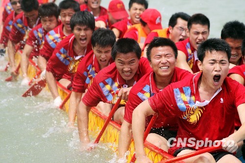 端午节前夕,首届海峡两岸龙舟邀请赛6月12日在当年中华民族的扬威之地——山东省枣庄市台儿庄的京杭古运河上举行,来自台湾和浙江、江苏、山东的13支代表队以及由美国、法国、波兰等地选手组成的国际友人代表队的366名选手参加了比赛。图为来自台湾的龙舟代表队在比赛中。 中新社发 闫锋 摄
