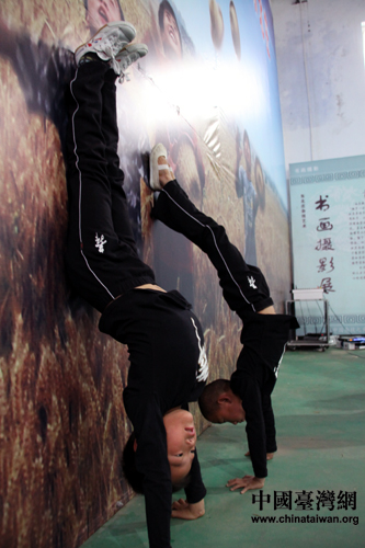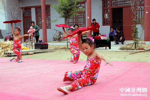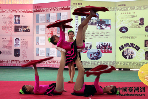 中国台湾网9月25日河南消息 钻圈、柔功、硬气功、魔术……今天,濮阳东北庄杂技艺术团的孩子们为两岸记者奉上了精彩的演出。