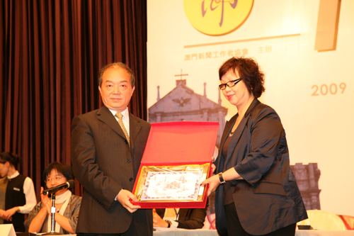 澳门团代表向内地团团长、中国记协书记处书记顾勇华(左)赠送礼品 陈建平 摄