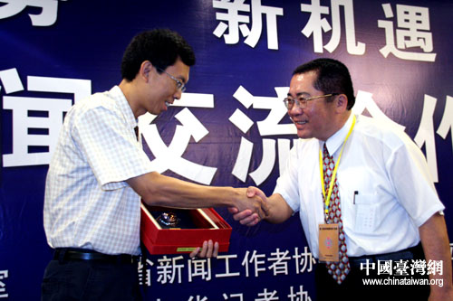 中央电视台中文国际频道《海峡两岸》节目制片人高辉(左)与台湾中华记协理事长黄汉东