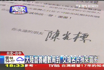 据报道,2月5日大年初三,陈光标离开台湾第4天,曾经和他换过名片的台湾记者,几乎都收到了他跨海寄来的亲笔签名贺年卡。元宵节前,陈光标又送上礼物,这回更费工夫,快递直达一份荣誉证书,大红色绒布封面,烫金字体,翻开证书,底下署名陈光标,内书感谢某某记者,因您的吃苦和敬业精神及您为慈善做出的贡献,特授予功德无量奖。(中国台湾网 吴斌)