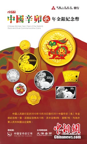 图片说明:2011年辛卯兔年将至,图为正在热销2011中国辛卯(兔)年金银纪念币的中国金币总公司在台湾的总经销,位于台北市和平东路三段68之1号的台湾大洋金银币公司的推介广告。