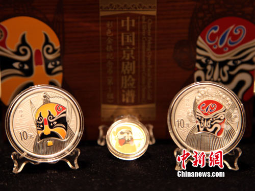 中国人民银行发行的中国京剧脸谱彩色金银纪念币(第1组),其中金币1枚,银币2枚,2010年在台湾面市。图为去年11月16日,中国金币总公司在台湾的总经销,位于台北市和平东路三段68之1号的台湾大洋金银币公司展售的该套金银纪念币。