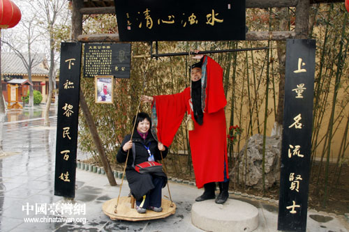 中国台湾网3月31日开封消息 在豫联合采访的两岸20余位媒体人,昨天参访了七朝古都开封,不想期间遭遇两个“包公”,一个诙谐幽默,司长“清明上河园”内一杆大宋公平秤;一个冷峻威严,坐镇“开封府”里张扬正大光明。