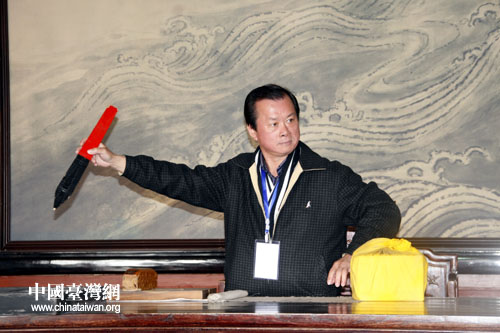 台湾媒体同行在“开封府”大堂之上,模仿包公。(钟宝华 摄)