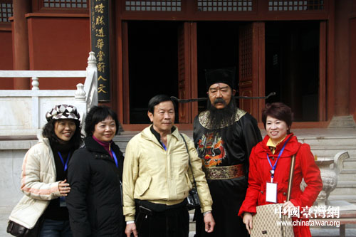 台湾媒体人在“开封府”内和“包公”合影。(钟宝华 摄)