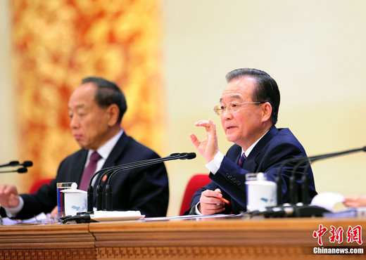 3月14日,十一届全国人大四次会议闭幕,温家宝总理举行记者会答中外记者问时表示,我们和台湾人民是同胞,骨肉之亲析而不殊。中新社发 张丽君 摄