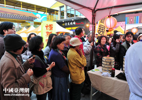 首届“高雄市灯会艺术节暨北京特色周”,台湾民众排队购买北京特色小吃。(资料图片)