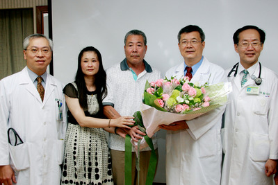 福建泉州男子施纯炳(中)因罹患心脏疾病,在台南奇美医院进行手术,成为台南地区首例赴台就医的大陆人士。2日他与女儿(左2)一起向主治医师致谢。图片来源:台湾“中央社”
