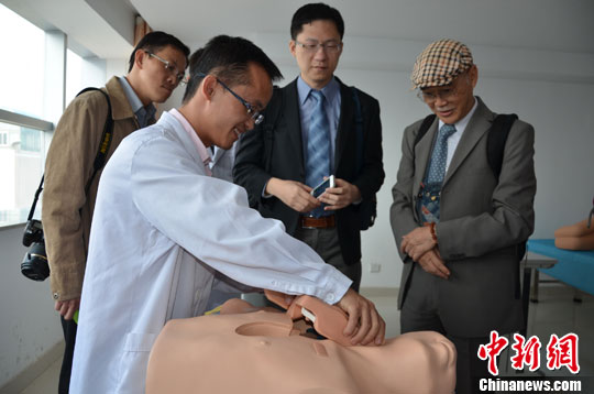图为8月7日,台湾高雄长庚纪念医院医学博士陈顺胜(右一)、台北市立联合医院阳明院区家医科主治医师陈明正(右二)参观西宁市第一人民医院护理技能实训室(标准化实训病房)。中新社发 赵帅 摄