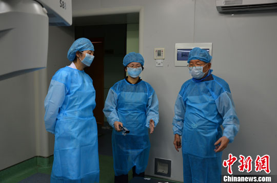 图为8月7日,台湾全人照顾协会理事长严长庚(右一)、台湾蒙藏委员会藏事处科长陈雅芳(右二)参观西宁市第一人民医院眼科手术室。中新社发 赵帅 摄