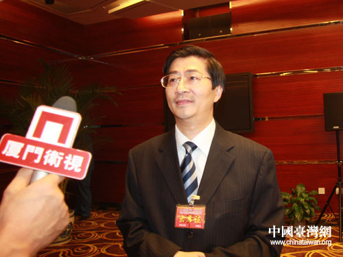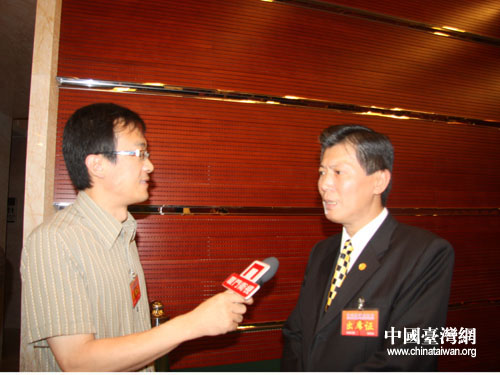 温州管理科学研究院院长、温州中小企业发展促进会会长周德文正在接受本网记者和厦门卫视记者的联合采访。(中国台湾网 肖燕 摄)