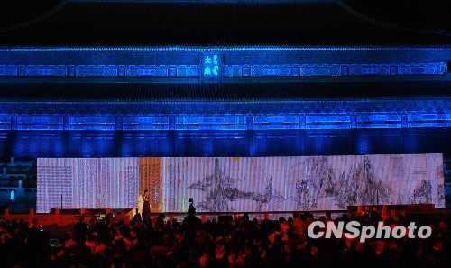 5月15日晚,珍藏在海峡两岸博物馆的《富春山居图》在北京太庙通过屏幕实现“合璧”。中央文史研究馆馆长袁行霈为活动致辞,并与馆员欧阳中石、程毅中、沈鹏、傅熹年、侯德昌、舒乙一起为高仿真的《富春山居图》题跋。 中新社发 杨慧峰 摄