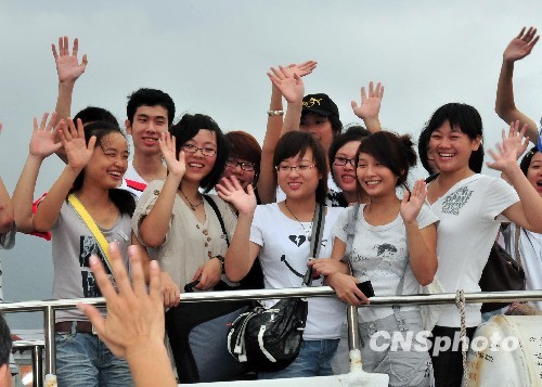 资料图片:2009年9月16日,起程赴台就读一年的福建23名在校大学生在福州马尾登船后,向前来送行的家人和师生挥手告别。这是福州大学、福建师范大学等福建高校近200名赴台学生中首批前往台湾的学生,也是大陆率先成批次选派学生赴台湾高校学习。中新社发 张丽君 摄
