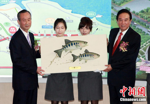 2月27日,大陆海协会会长陈云林一行来到位于台湾桃园县的远雄自由贸易港区参访,远雄企业团董事长赵藤雄(左一)向陈云林致赠一幅“台湾鲑鱼”纪念品。中新社记者 符永康 摄