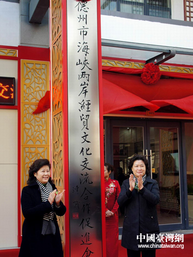 中国台湾网12月12日德州消息 12月10日,山东省德州市海峡两岸经贸文化交流合作促进会成立。山东省台办主任张雪燕,德州市委书记、市人大常委会主任吴翠云出席仪式并为促进会揭牌。德州市委副书记袁秀和等德州市领导以及台湾两岸企业集团董事长吴昭南、丽乔实业有限公司董事长陈丽芳等台商代表出席仪式。