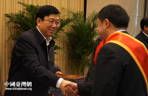 会议表彰了2009至2011年度全省对台工作先进集体和先进个人。图为:四川省委副书记李春城向先进个人颁奖。(图片来源:四川省台办)