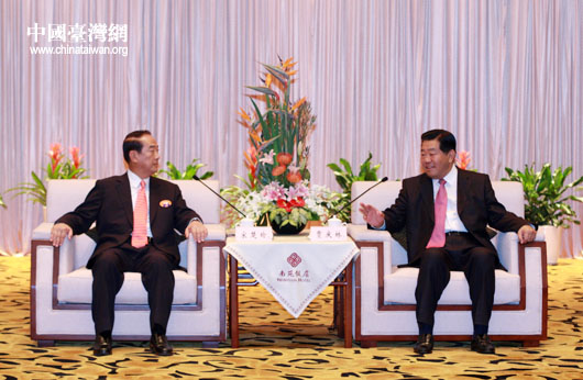 11月7日晚,中共中央政治局常委、全国政协主席贾庆林在宁波会见率团出席两岸农渔水利合作交流会的亲民党主席宋楚瑜一行。(中国台湾网 钟宝华 摄)
