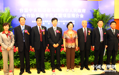 台盟中央主席林文漪(右四)、台盟中央副主席黄志贤(左三)、河南省副省长宋璇涛(左四)等出席台盟中央联络部与焦作市签署合作协议仪式。(中国台湾网 孙金诚 摄)